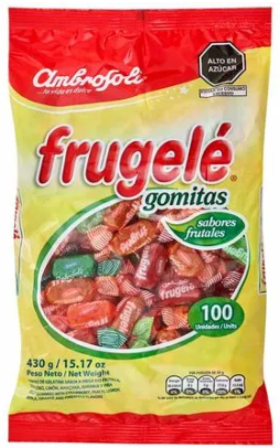 Gomas dulces AMBROSOLI FRUGELÉ con sabores de limón, naranja y piña en presentación de bolsa de 430 g, elaboradas con una textura suave y sabores frutales intensos, ideales para compartir, disfrutar en reuniones o como snack dulce en cualquier momento del día.